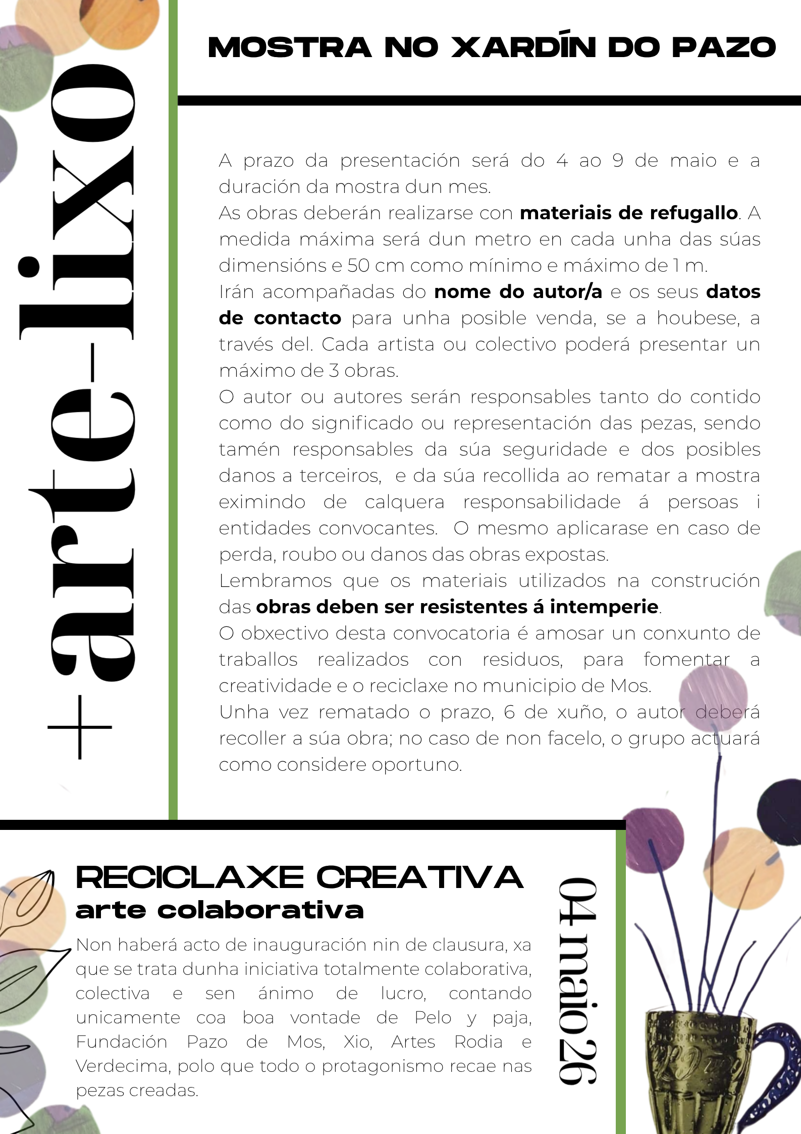 O Xardín do Pazo de Mos convértese nun espazo vivo de creación coa mostra +arte | reciclaxe creativa, unha proposta que vai máis alá dunha exposición tradicional.